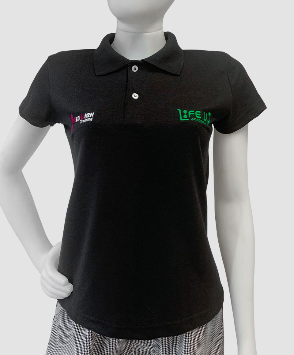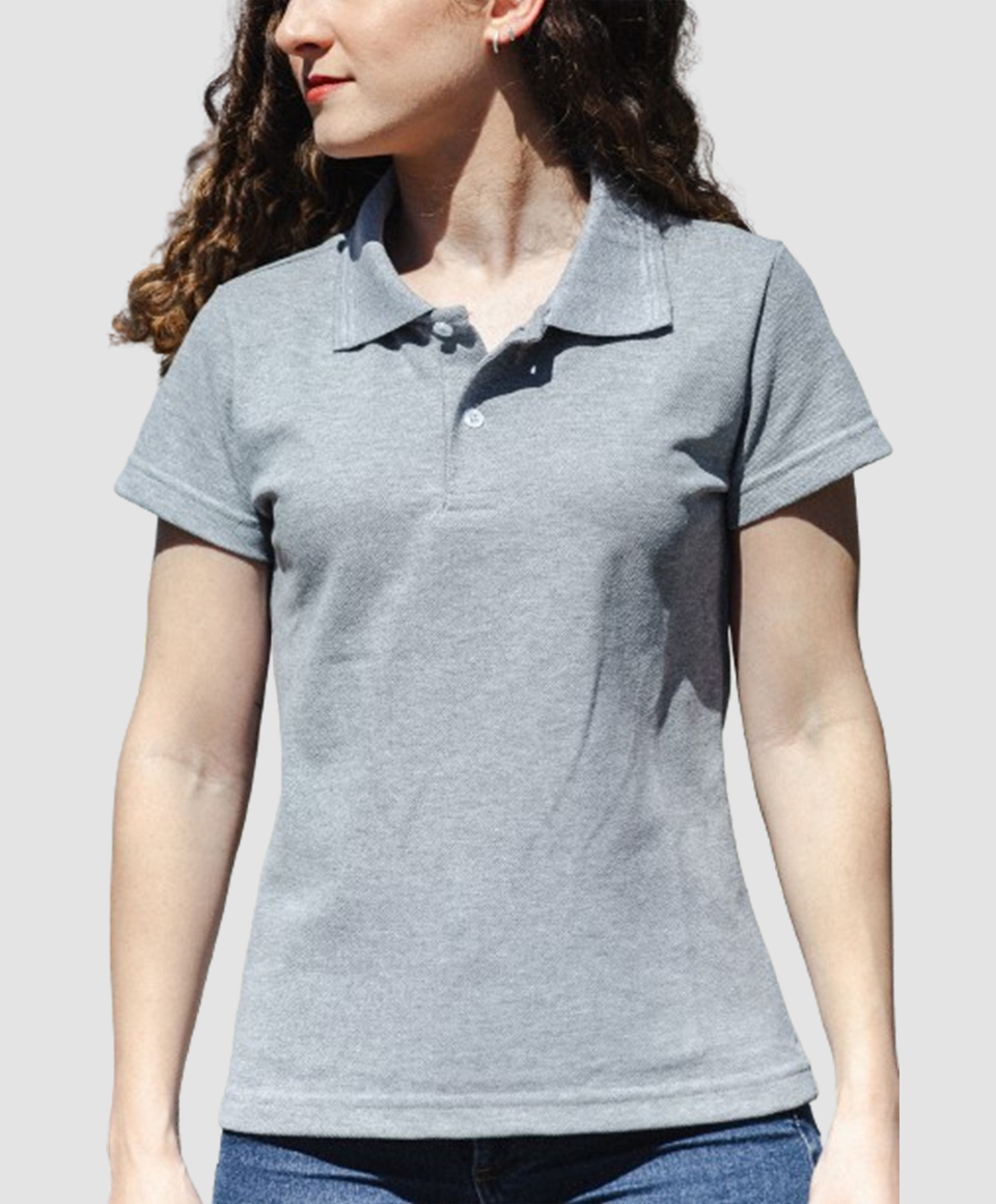 Camisa polo feminina manga curta e malha fio 30/1 com composição em PA (50% algodão / 50% poliéster).