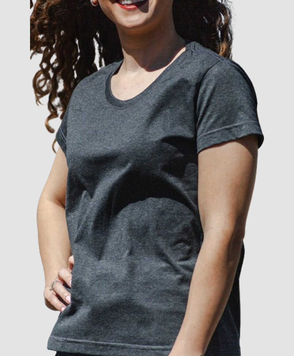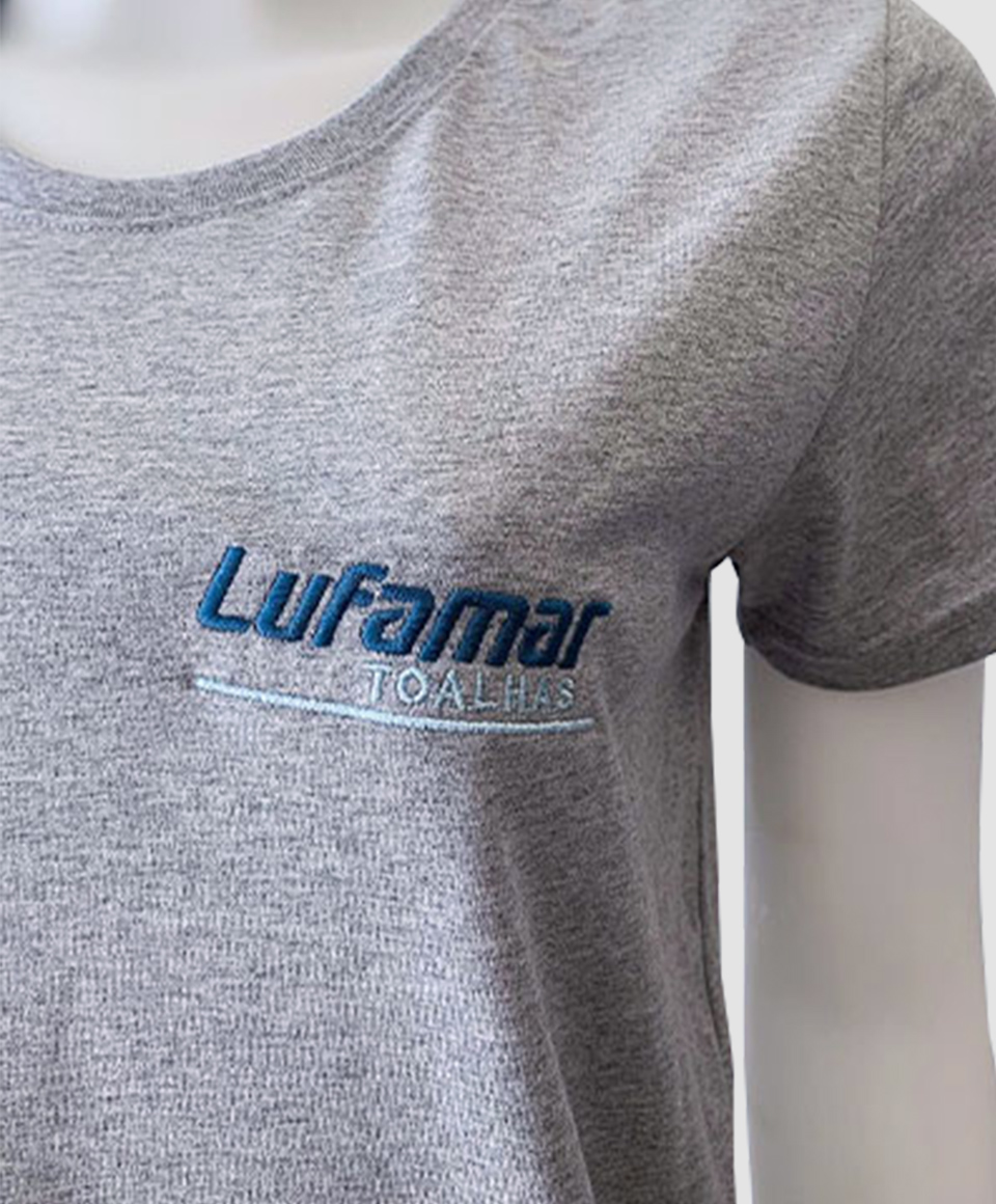 Camiseta básica feminina manga curta com composição em 50% algodão e 50% poliéster.