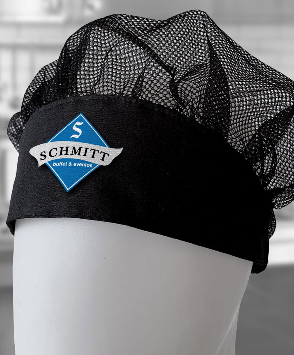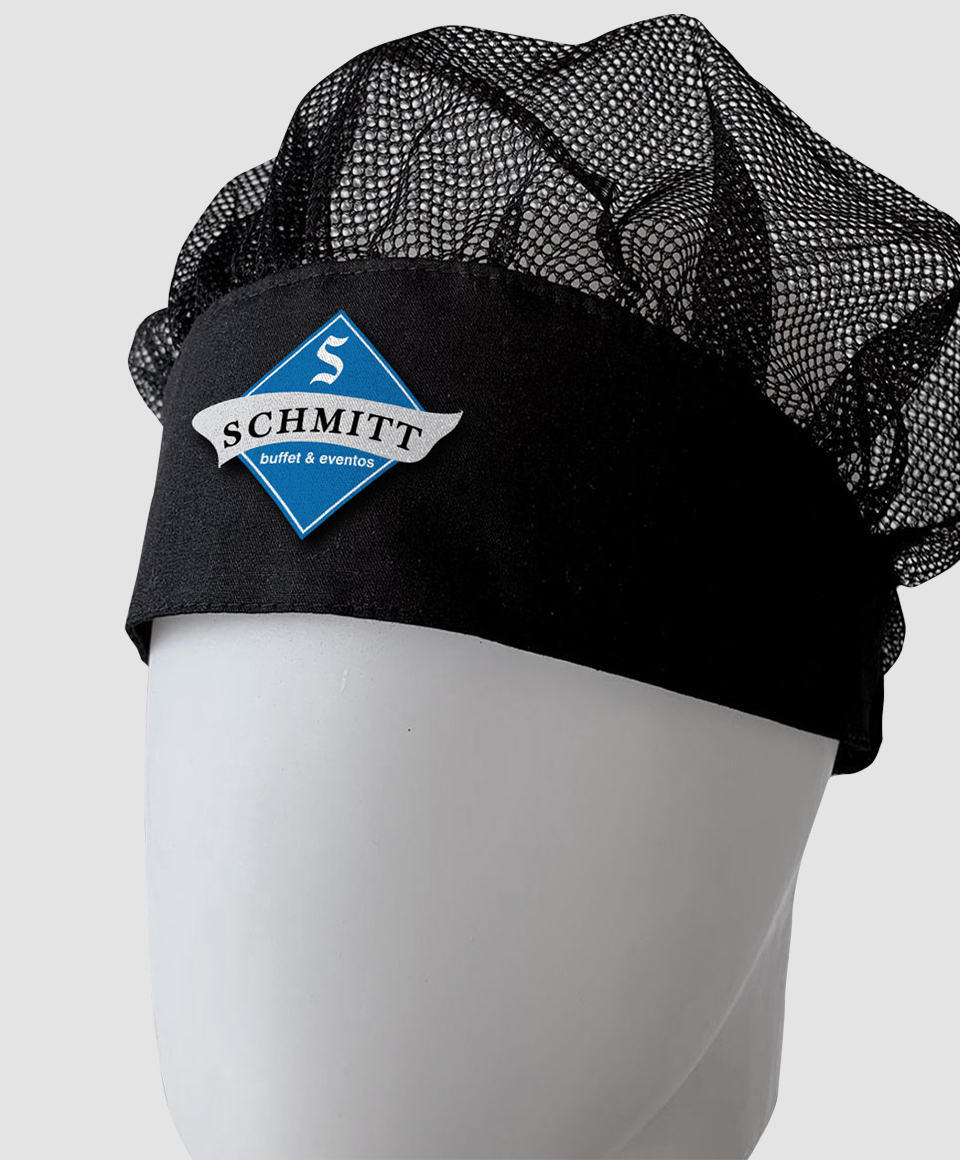 Touca redinha unissex personalizável em tricoline com composição em 100% algodão (faixa) e 100% poliéster (redinha).
